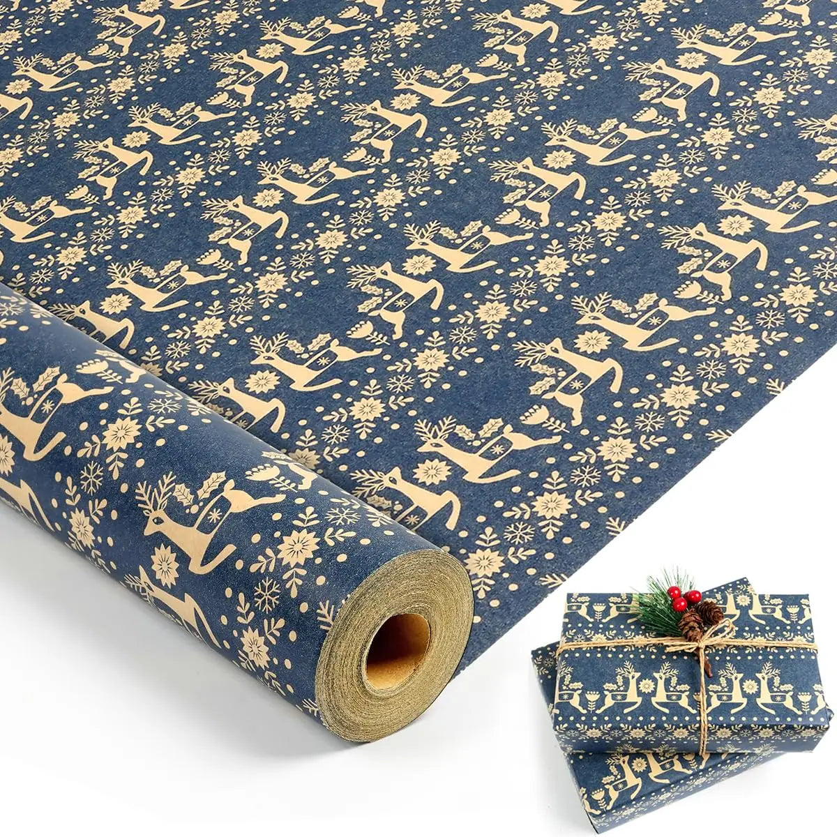 1 rollo de papel de regalo navideño de 43 cm x 15 mts aprox., papel Kraft, copo de nieve, diseño floral y de renos de Navidad