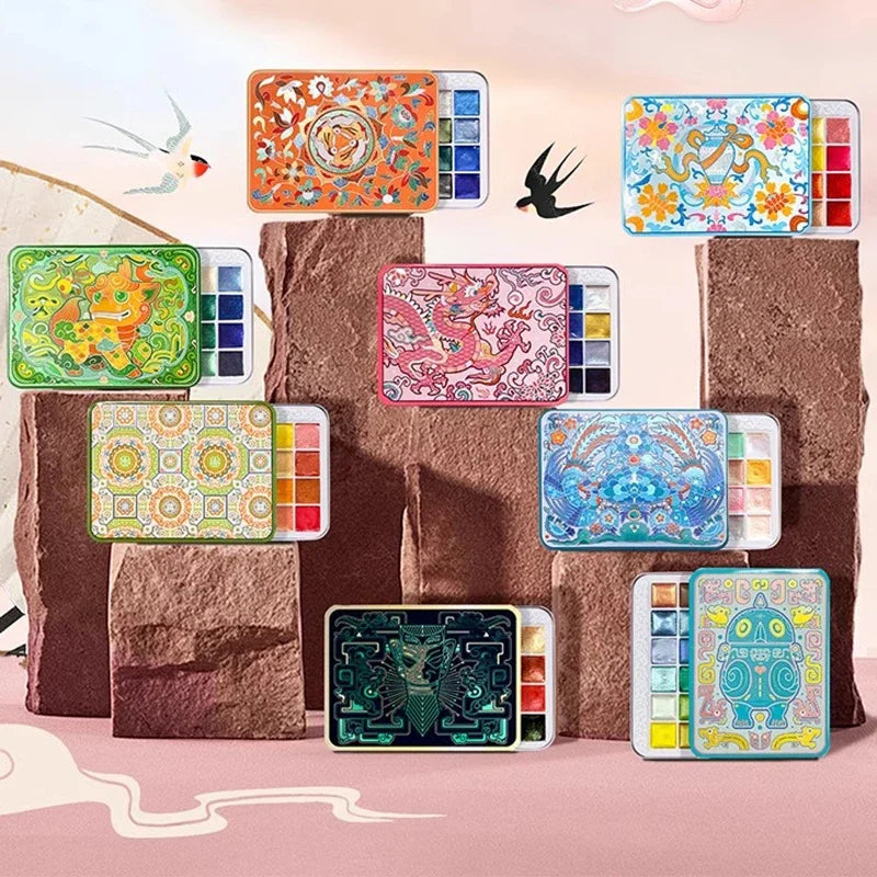 Paleta de pintura de acuarela sólida metálica nacarada, portátil, empaquetada a mano, suministros de arte, 24 colores