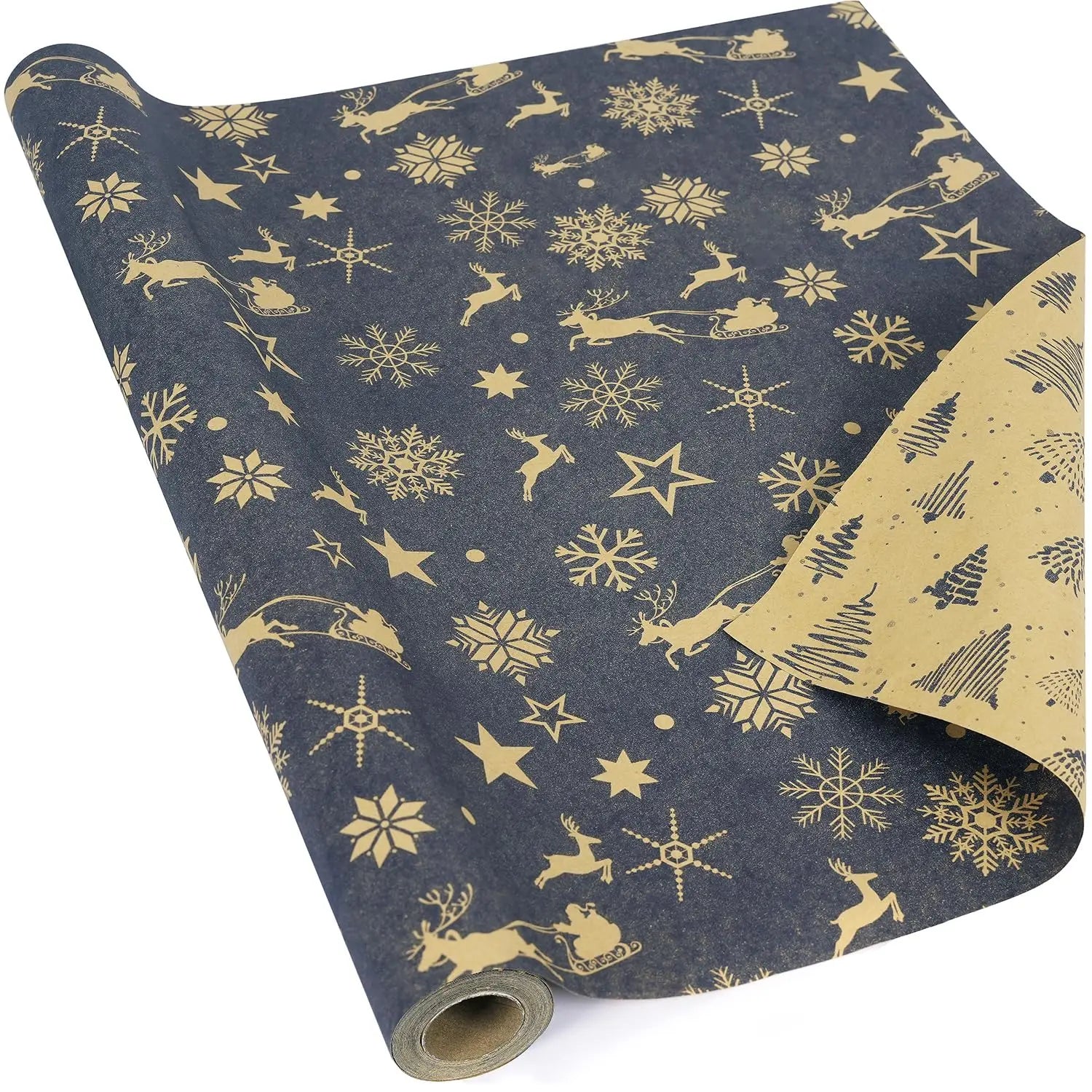 Nombre; 1 rollo de papel de regalo navideño de 44 cm x 15 mts aprox., papel Kraft, copo de nieve, diseño floral y de renos de Navidad