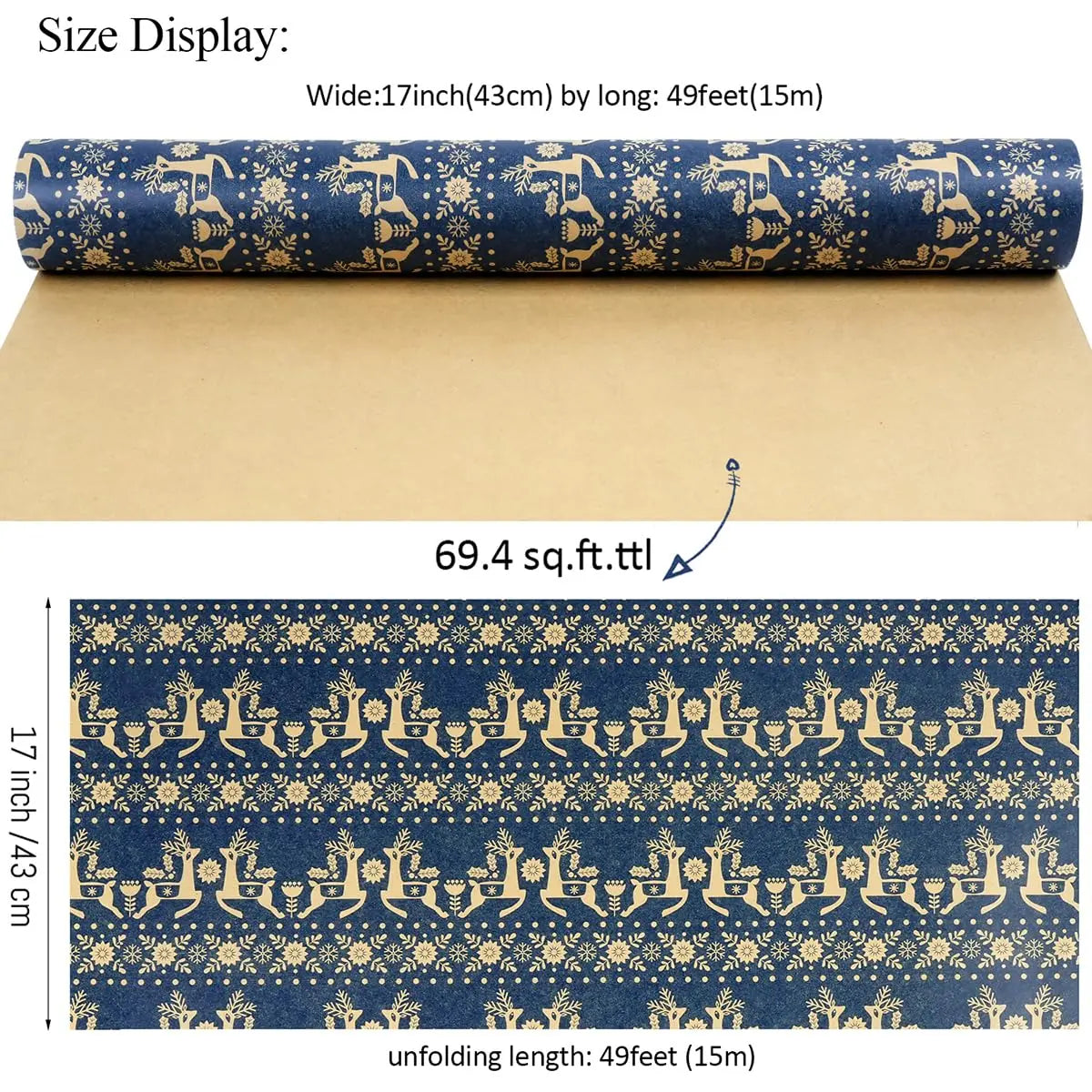 TAMAÑO: este rollo de papel de regalo navideño mide 17 pulgadas de ancho por590 pulgadas largo, alrededor de 510 g de peso.