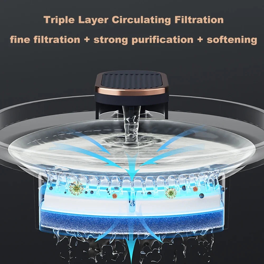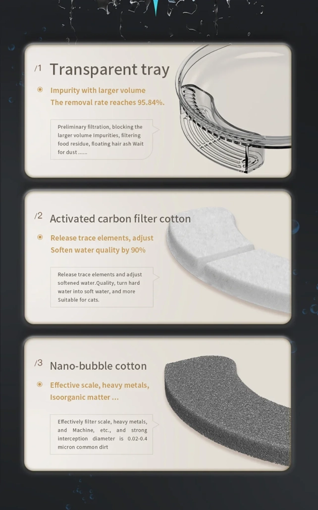 El filtro de cuatro capas refresca el líquido mediante su sistema de circulación, lo que sigue el estándar requerido mantiene a las mascotas alejadas de enfermedades gastrointestinales: mejora el sabor del agua, desminériza el agua para reducir el riesgo y bloquea partículas grandes y contaminantes de gran diámetro, etc.