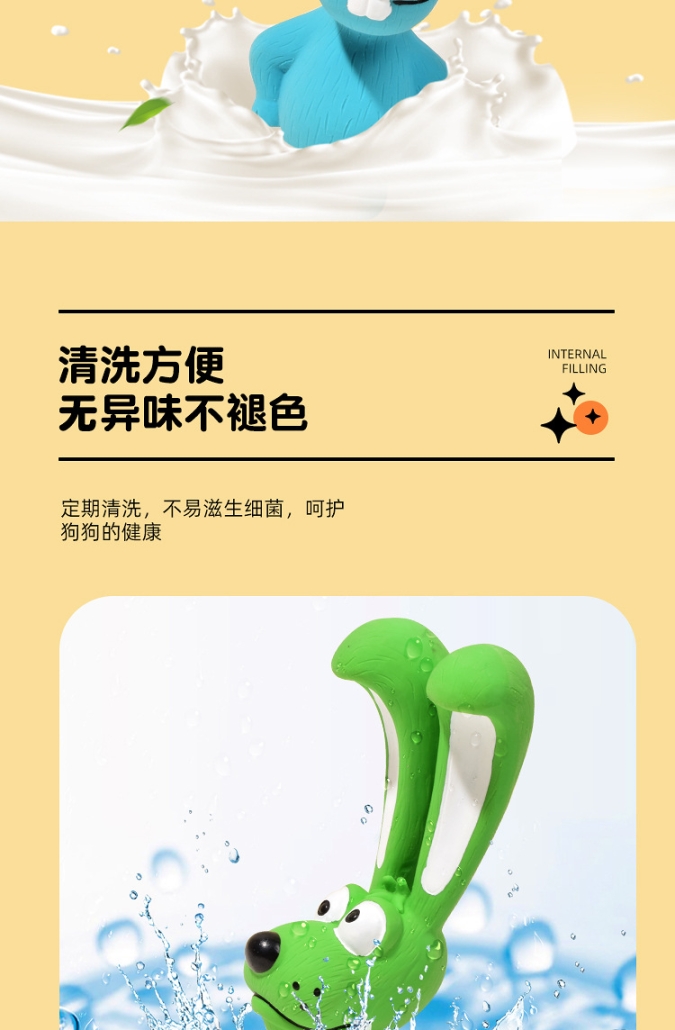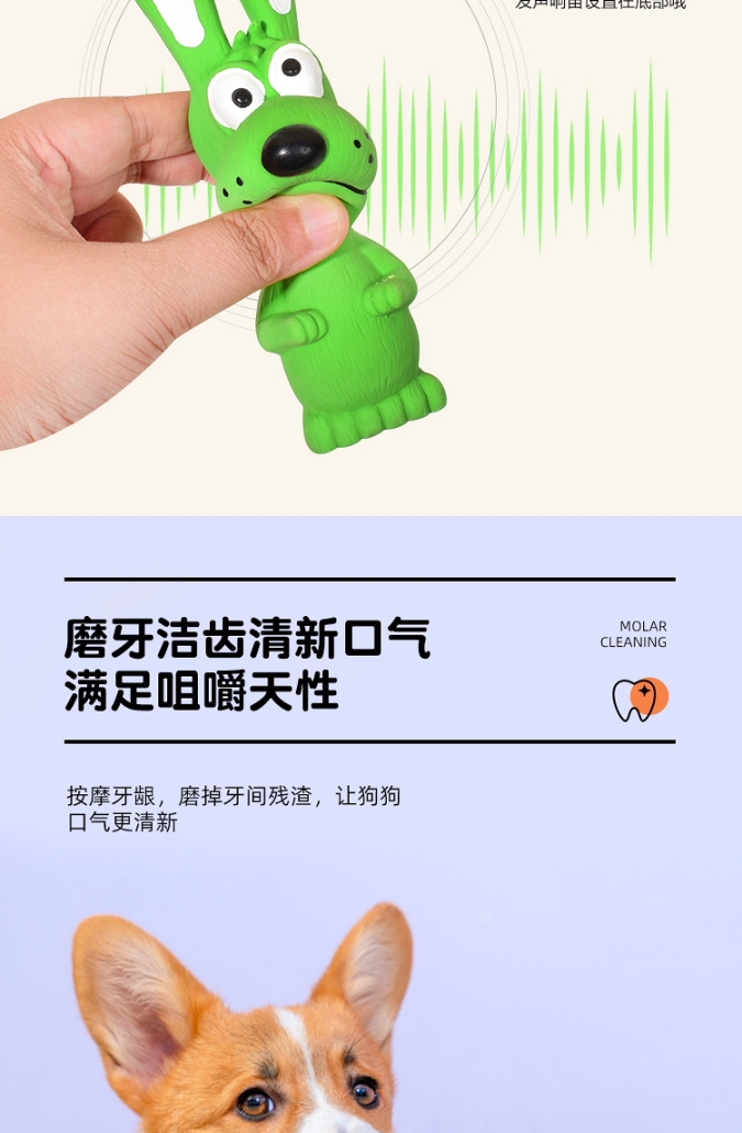 El divertido diseño de conejo de orejas largas y su sonido chirriante interno estimulan el instinto de juego, ayudando a reducir el estrés y promoviendo ejercicio saludable. Su textura suave protege dientes y encías, convirtiéndolo en el juguete perfecto para el uso diario.