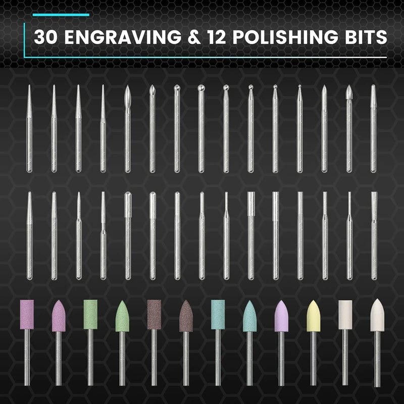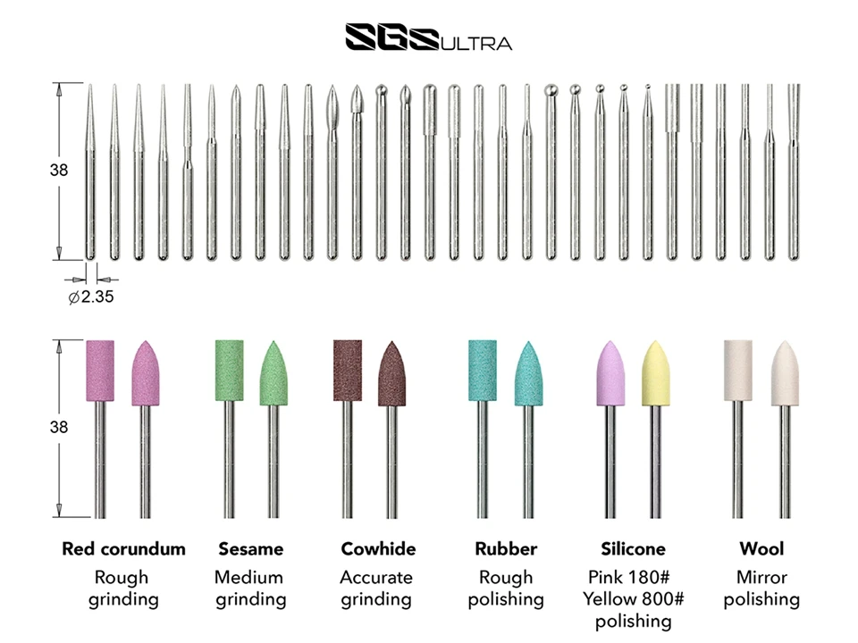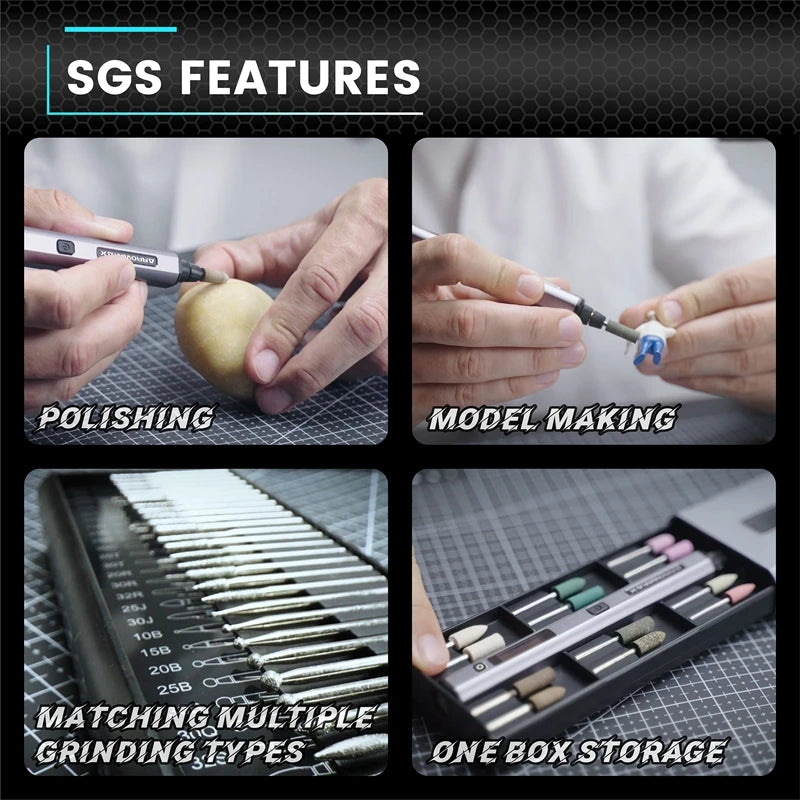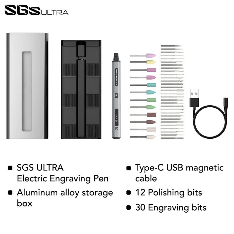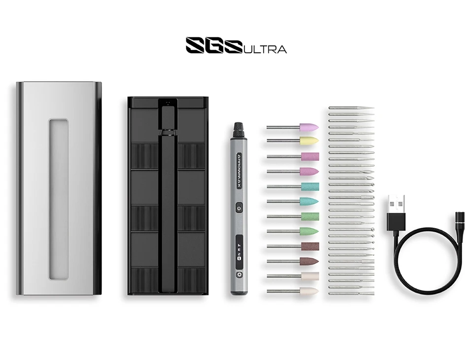 SGS ULTRA viene con una caja de almacenamiento de aleación de aluminio, que es conveniente para el almacenamiento y gestión de todos los accesorios. Contiene 12 brocas de pulido y 30 brocas de grabado. Las piezas están mecanizadas con precisión CNC, por lo que cada trabajo puede ser preciso y ágil.