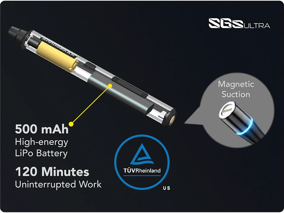 La batería LiPo de alta capacidad especialmente formulada hace que el uso sea más eficiente del espacio interno del producto y la capacidad de la batería LiPo alcanza los 500 mAh.Con diseño de carga magnética, se puede utilizar durante 2 horas y se carga completamente en 80 minutos.y su carga puede durar hasta 90 días sin uso- La batería LiPo que utilizamos ha pasado la certificación TUV de EE. UU.